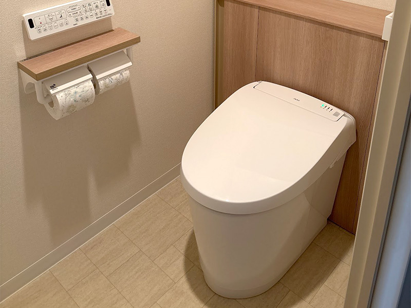 トイレ:LIXIL Jフィット I型 手洗い付 紙巻き器:LIXIL 棚付2連紙巻器(色:ライトオーク、品番:CF-AA64KU) |